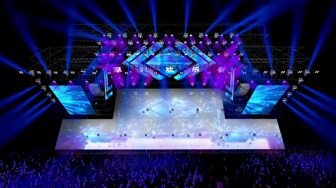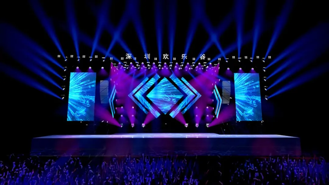本次舞台布置在阳光海岸,舞美设计的主题围绕“深圳欢乐谷夏浪音乐节”展开,旨在营造一个充满活力、激情和创意的舞台效果,让观众沉浸在音乐与视觉的双重盛宴中。舞台设计注重层次感,通过不同高度的平台和结构,营造出一种立体的视觉效果,舞台中央的屏幕和灯光装置较高,两侧逐渐降低,形成一种自然的视觉引导。主色调选用了粉色和紫色,这两种颜色不仅具有强烈的视觉冲击力,还能传达出一种梦幻和浪漫的感觉,符合夏日音乐节的氛围。辅助色调搭配白色和蓝色的灯光,增加了舞台的层次感和深度,使整体视觉效果更加丰富。